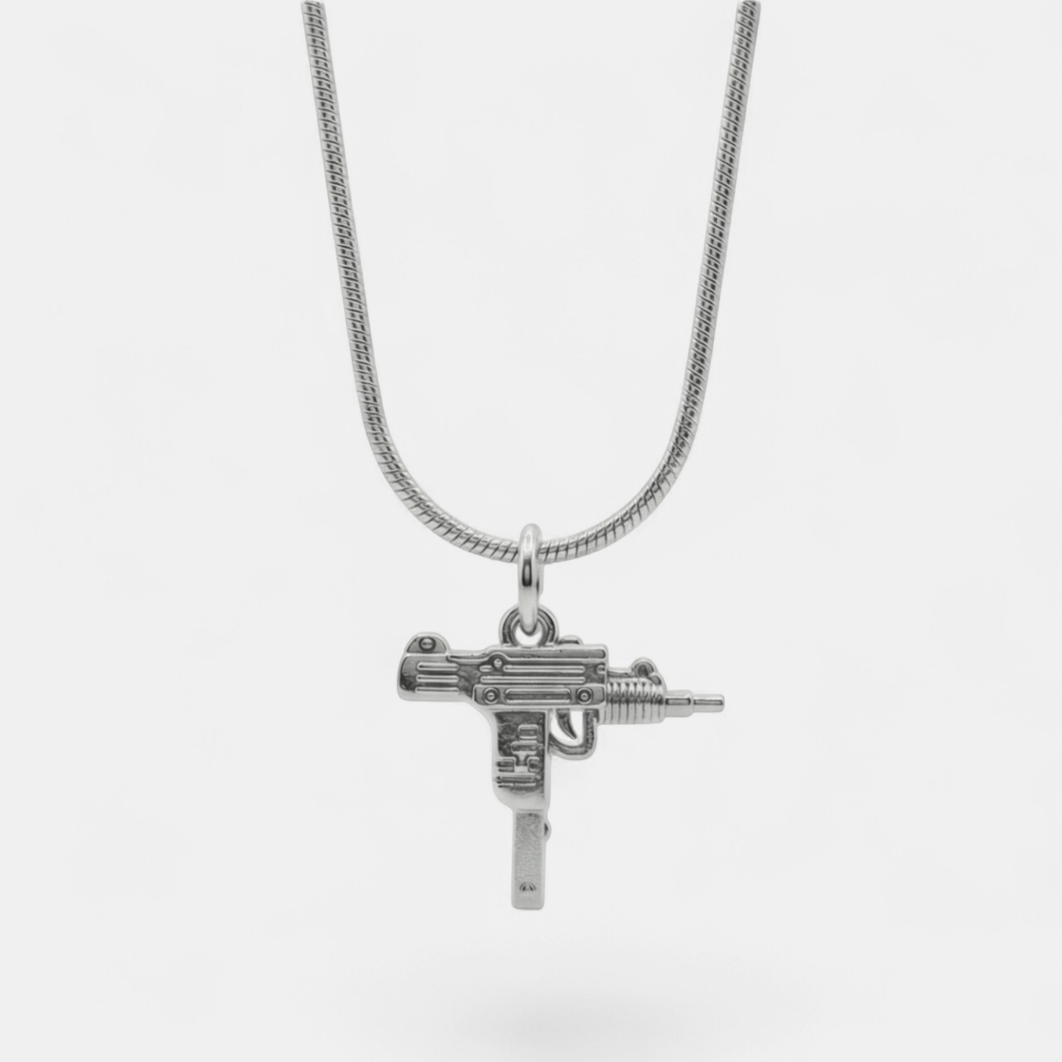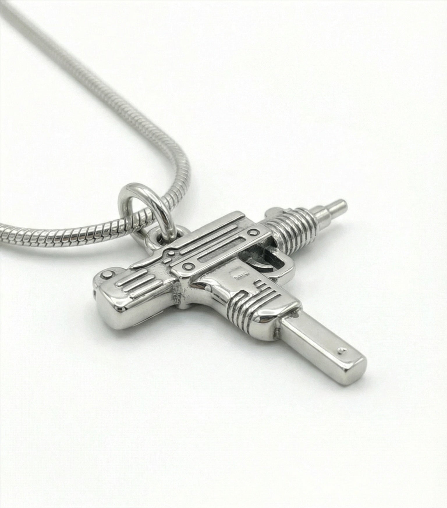 A bold silver Uzi-shaped pendant with sharp detailing and a modern edge. Designed for a strong, statement look with urban style vibes.